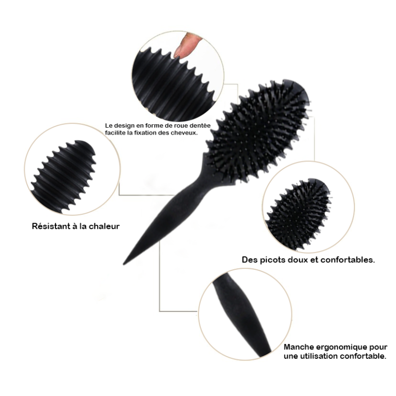 Notre brosse de bouclage manuelle conçue spécialement pour sublimer les boucles : démêlage doux, définition fine et respect total de la texture naturelle.